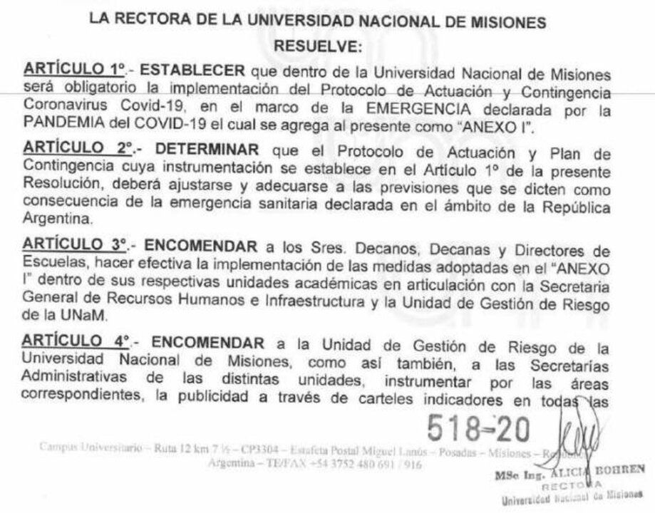Mediante la Resolución N° 518/2020 del 30 de septiembre del corriente año, la rectora de la Universidad Nacional de Misiones (UNaM), magíster Alicia Violeta Bohren, dejó establecido el Protocolo de Actuación y Contingencia Coronavirus Covid-19. En el Anexo I se señalan todas las medidas que deben ser adoptadas por las unidades académicas de la UNaM, […]