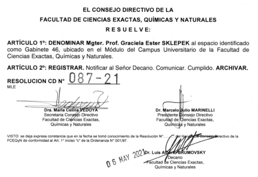 El jueves 12 del corriente a las 17 horas se descubrirá la placa en homenaje a la Mgter. Prof. Graciela Ester Sklepek (24/06/60 – 11/08/18) en el gabinete 46 del módulo Campus de la Facultad de Ciencias Exactas, Químicas y Naturales. El mismo se ubica en la planta media del edificio y desde entonces llevará […]