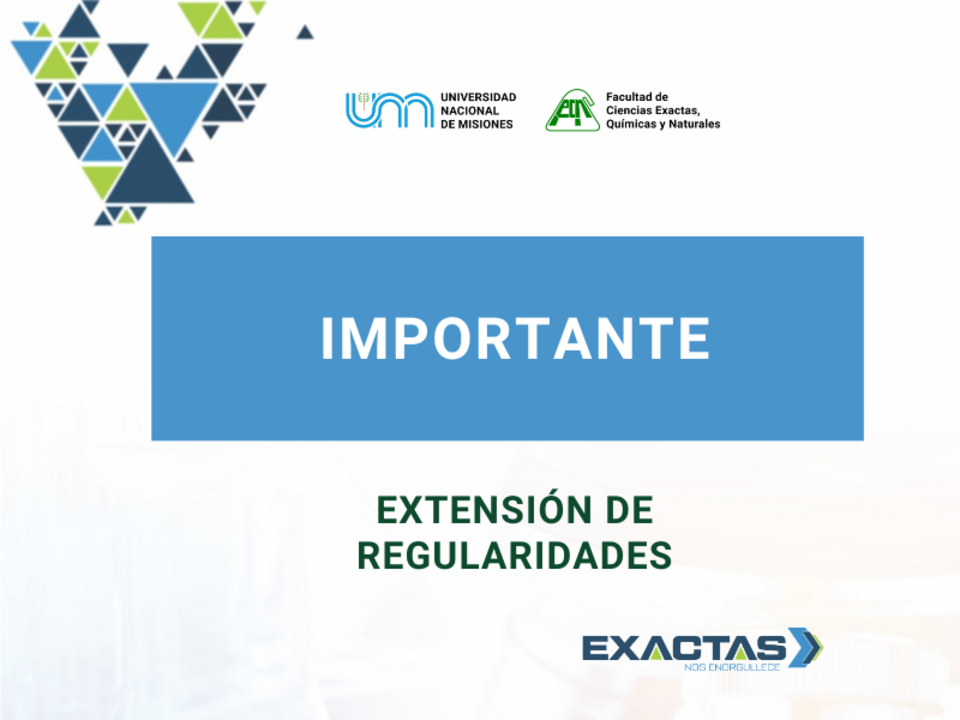Se comunica a los estudiantes de la FCEQyN que luego de haber recibido solicitudes de Extensiones de regularidades de parte del Centro de Estudiantes y de varias agrupaciones estudiantiles, y habiendo charlado con algunos de ellos sobre la problemática, la Secretaría Académica FCEQyN ha decidido contemplar la extensión de regularidades de forma excepcional, para aquellos […]