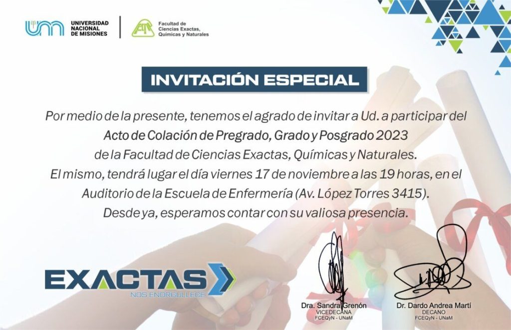 El próximo viernes 17 de noviembre a las 19 horas es el Acto de Colación de Grado, Pregrado y Posgrado FCEQyN-UNaM.