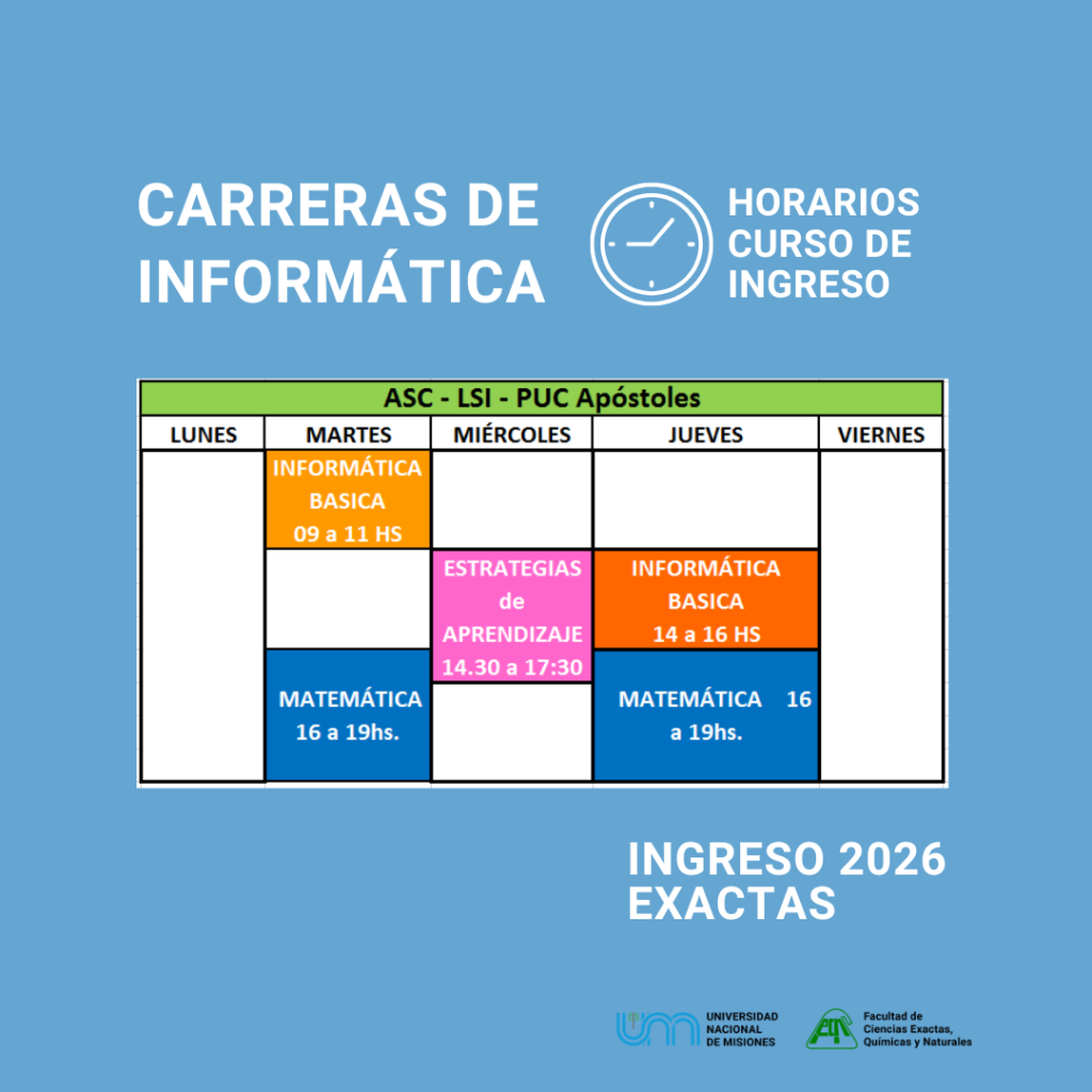 Las carreras de Informática de Apóstoles inician el martes 10/2 en el horario consignado en los esquemas.